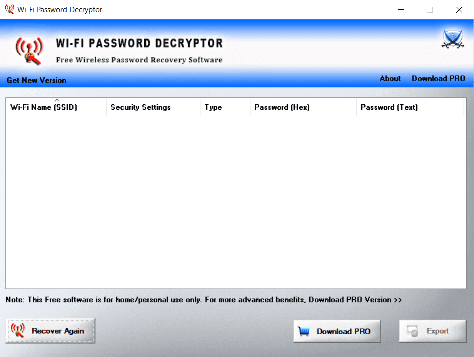 WiFi Password Decryptor — утилита предназначена для восстановления сохранённых паролей беспроводных сетей, которые хранятся в операционной системе Windows. Программа считывает данные из встроенного менеджера конфигураций Wi-Fi и отображает пароли, скрытые под символами звёздочек, что полезно в случаях, когда пользователь забыл ключ доступа к сети, ранее сохранённой на компьютере.