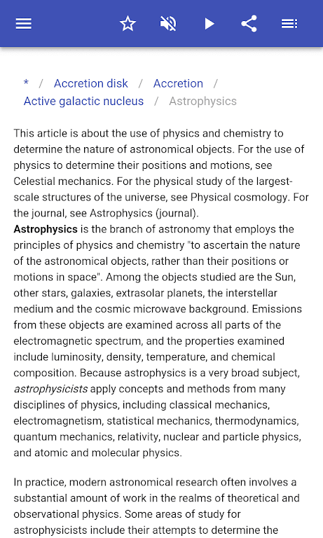 Astrophysics — приложение представляет собой компактный справочный инструмент, посвящённый основным направлениям астрофизики. Предназначено для пользователей, которые хотят получить обобщённое понимание физических процессов, происходящих во Вселенной. В приложении собраны базовые сведения о структуре космических объектов, принципах их формирования, свойствах излучения и методах наблюдений. Материал подаётся в сжатом и последовательном формате, что делает информацию удобной для изучения без необходимости обращаться к дополнительным источникам.