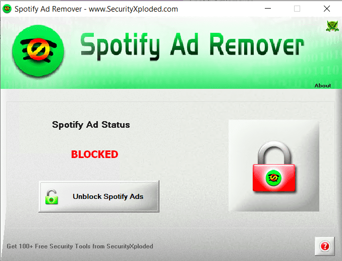 - Обеспечивает блокировку рекламных вставок в Spotify одной кнопкой.
