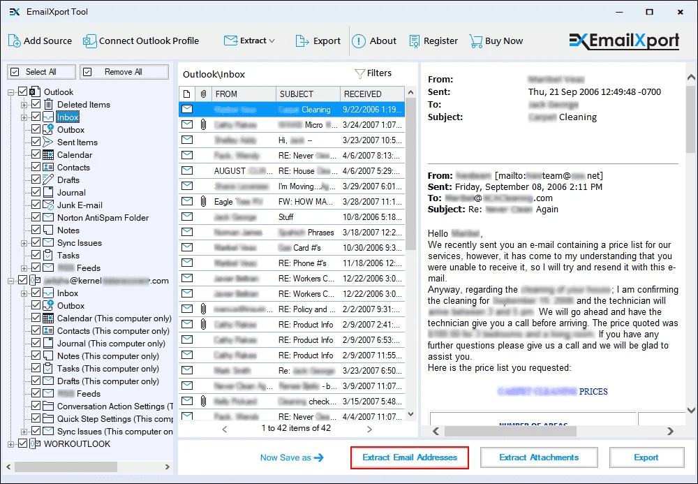 - Извлекает содержимое почтового ящика с возможностью выбора отдельных категорий данных.