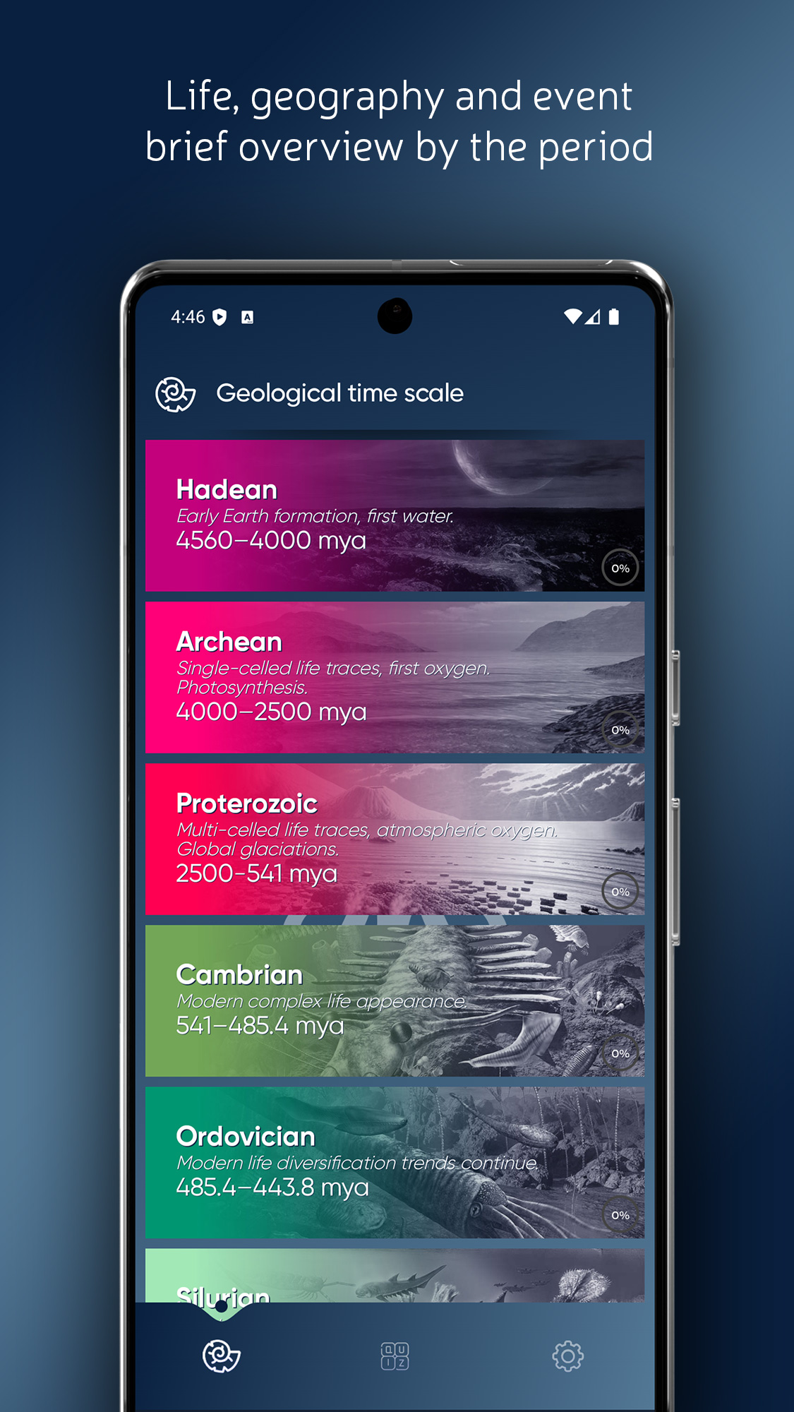 - Предоставляет информацию о 15 геологических периодах с описанием ключевых природных процессов и событий.
