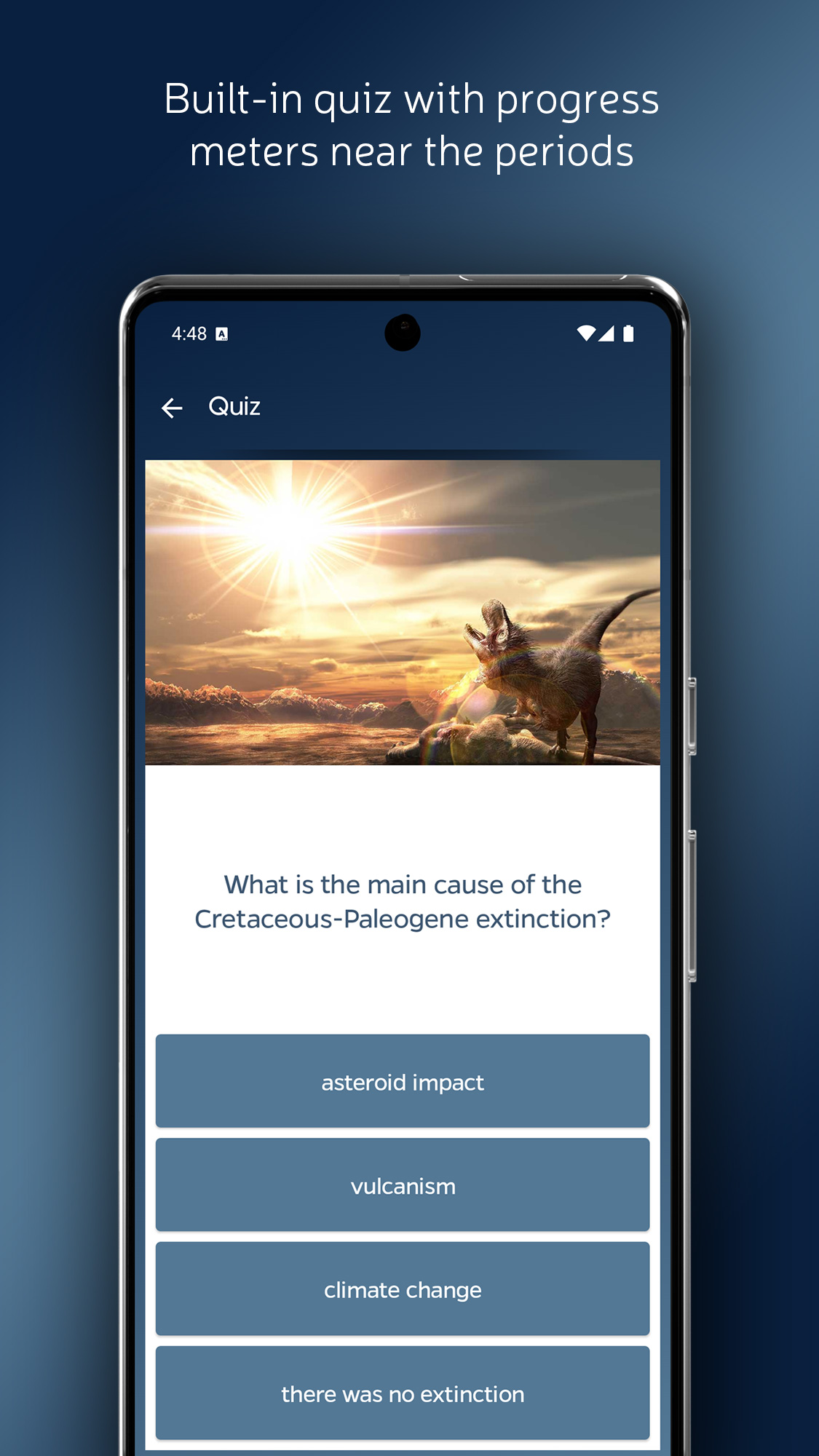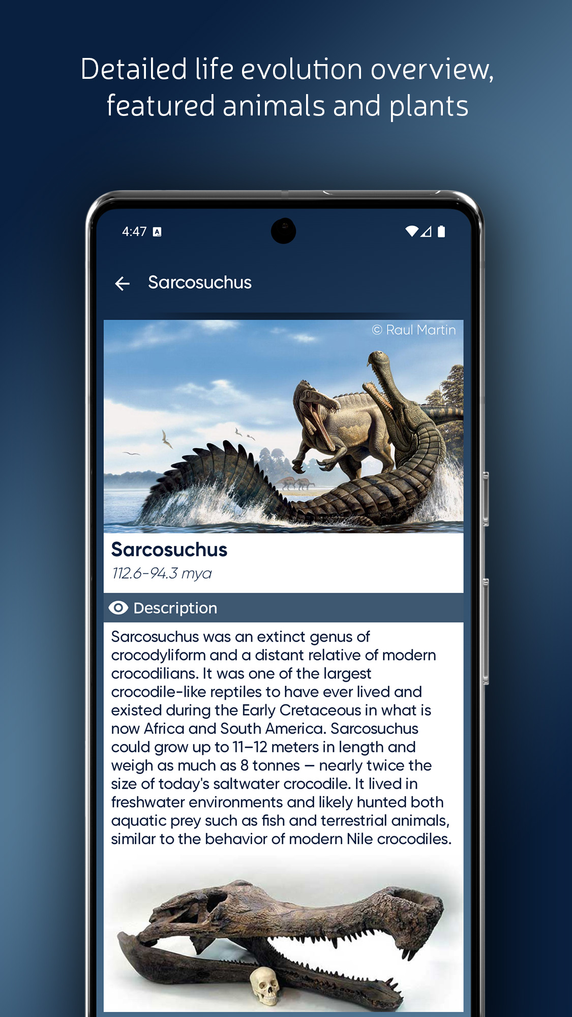 - Использует каталог из 174 видов древних растений и животных с краткими научными описаниями и фактами.