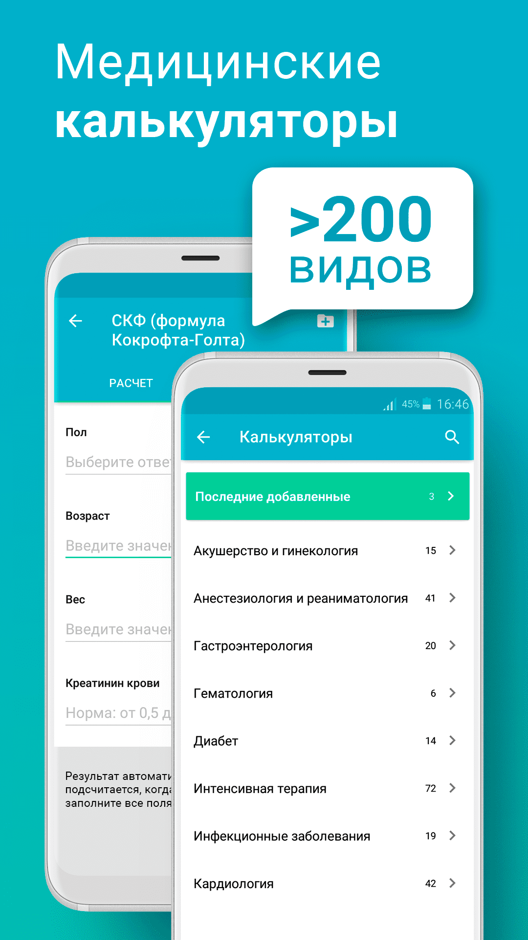 - Дает возможность более 200 медицинских калькуляторов по различным системам организма.