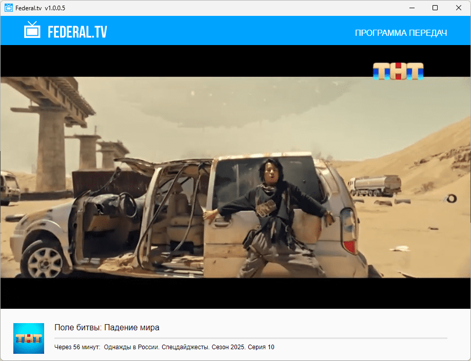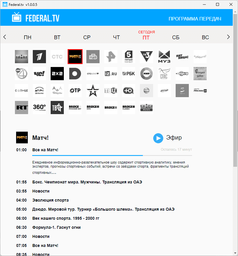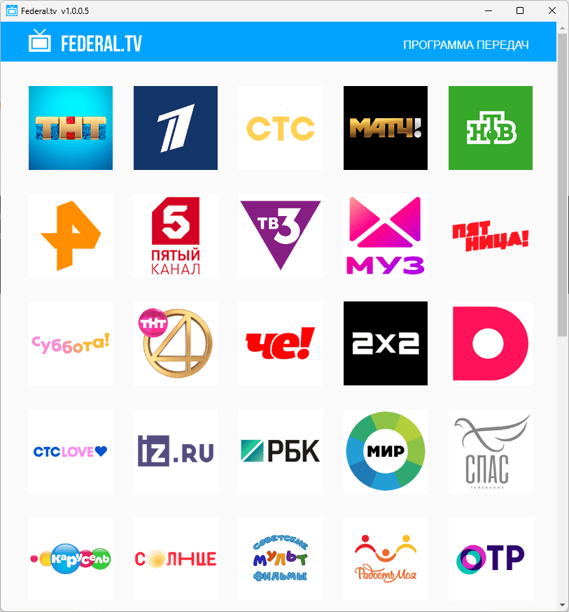ФЕДЕРАЛ.ТВ — удобная программа для бесплатного просмотра онлайн-телевидения в прямом эфире. Доступно более 40 популярных федеральных телеканалов России: Первый канал, ТНТ, СТС, МАТЧ ТВ, НТВ, РЕН ТВ, Пятый канал, Звезда, ТВ-3, МУЗ-ТВ, Пятница, Bridge TV и многие другие. Для любителей спорта по подписке доступны дополнительные каналы, включая Матч Премьер, Матч Футбол, Боец и другие тематические трансляции.