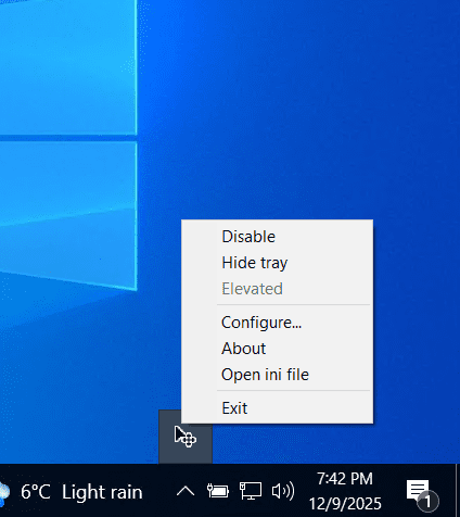 Графического интерфейса в привычном смысле нет, все управление осуществляется через значок в системном трее и файл конфигурации. Пользователь может включать и отключать программу, запускать её с повышенными правами, а также настраивать общее поведение утилиты в соответствии со своими задачами.