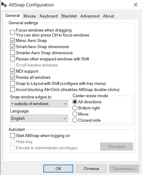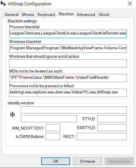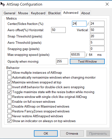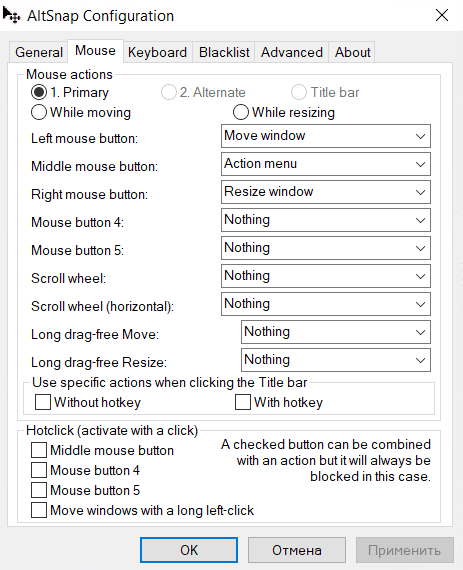Программа предоставляет широкие возможности кастомизации. Доступны настройки действий для основной и дополнительной кнопок мыши, клавиатурных сочетаний, а также управление списками исключений. Пользователь может задавать процессы и окна, которые следует игнорировать, или процессы, к которым нельзя применять функции программы. В расширенных параметрах предусмотрены такие возможности, как запуск нескольких экземпляров утилиты, автоматическая максимизация окна при переносе между мониторами, восстановление размеров окна одним кликом, изменение поведения привязки окон и другие параметры.