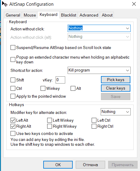 - Обеспечивает перемещение окон с помощью Alt и левой кнопки мыши из любой области окна.