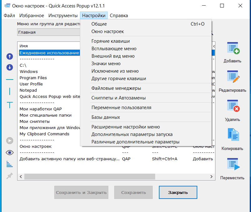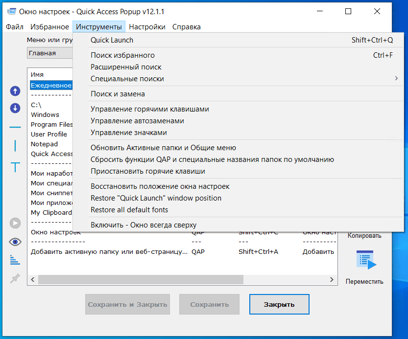 Quick Access Popup — инструмент для ускорения взаимодействия с операционной системой за счёт формирования собственного пользовательского меню. Программа упрощает доступ к frequently используемым директориям, файлам, программам и элементам системы, позволяет организовать удобную структуру навигации.