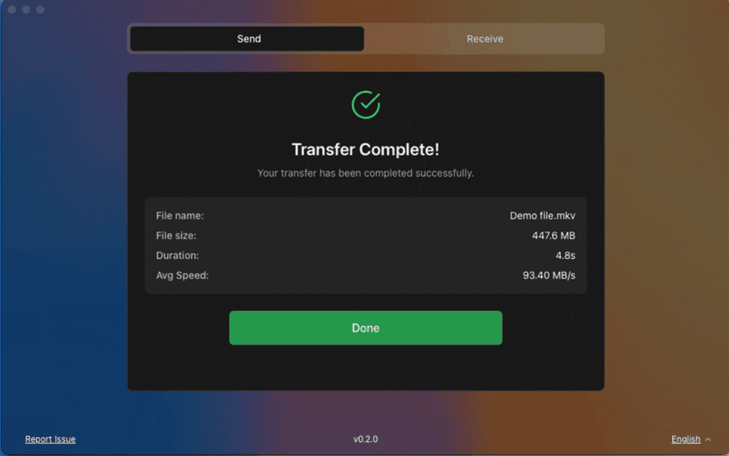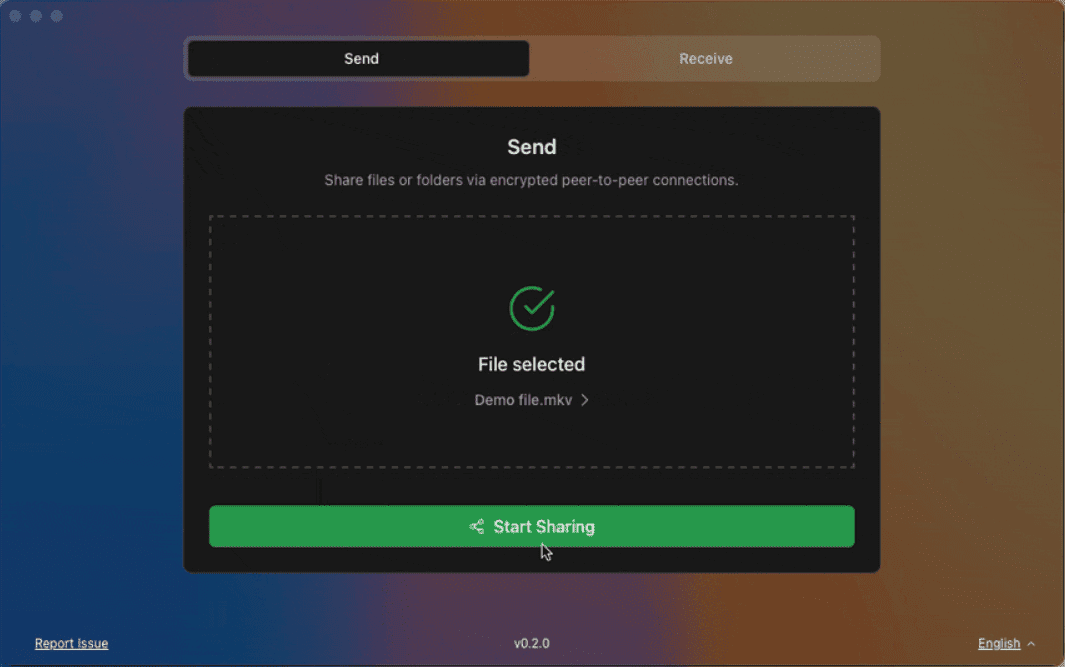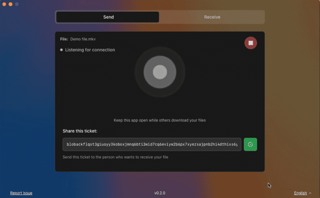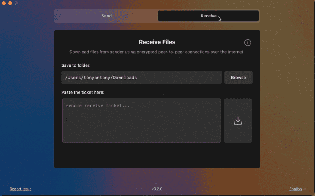 - Интегируется с Sendme CLI и автоматически открывает загруженные данные в проводнике системы.