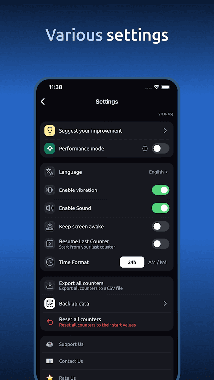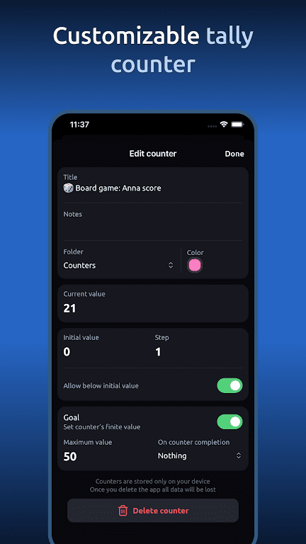 - Дает возможность настраивать имя каждого счётчика и изменять шаг увеличения.