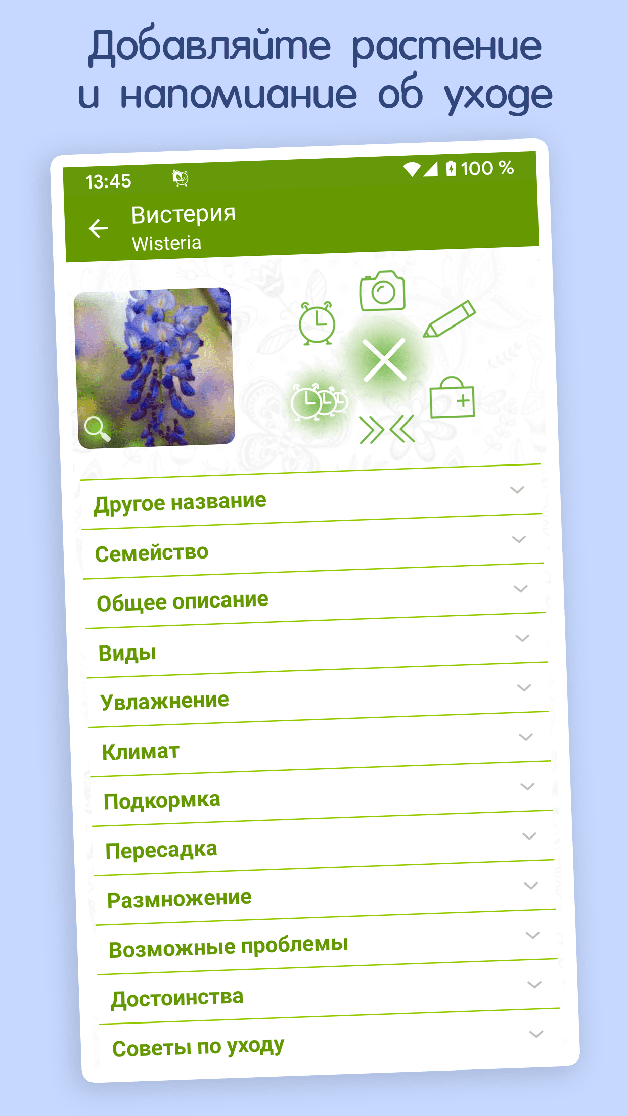 - Содержит базу растений с фото, описаниями и рекомендациями по уходу.