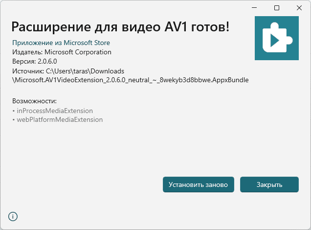 AV1 Video Codec — официальное расширение от Microsoft, предназначенное для поддержки видеокодека AV1. Обеспечивает возможность воспроизведения, а также кодирования видеоконтента, созданного с использованием формата AV1.