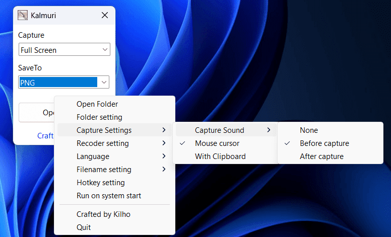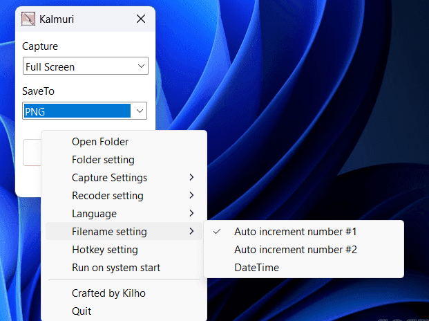 Kalmuri – приложение для захвата изображений и записи видео с экрана компьютера для повседневной работы с графической информацией, инструкциями, фиксации действий в программах, сохранения веб-страниц и визуальных данных. Программа не требует установки и может запускаться с внешнего носителя, что удобно при работе на разных компьютерах. Возможности видеозаписи позволяют фиксировать действия на экране в формате MP4 с использованием внешнего модуля FFmpeg, для удобства предусмотрено управление через горячие клавиши.