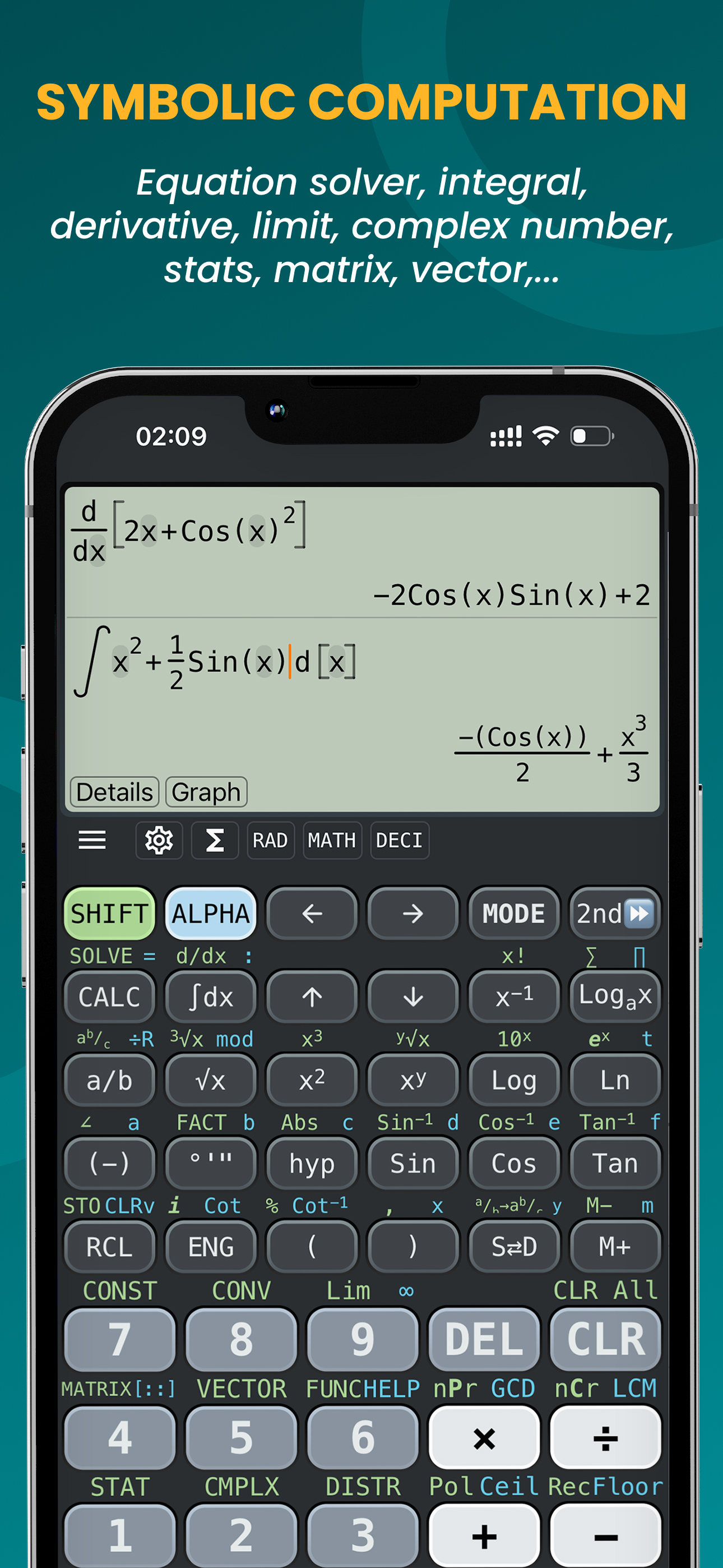 - Научный калькулятор с поддержкой комплексных чисел, производных, интегралов, пределов, матриц, векторов, статистики и распределений.