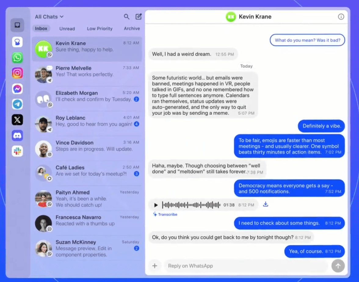 - Объединяет переписки из разных мессенджеров и социальных сетей в одном интерфейсе.