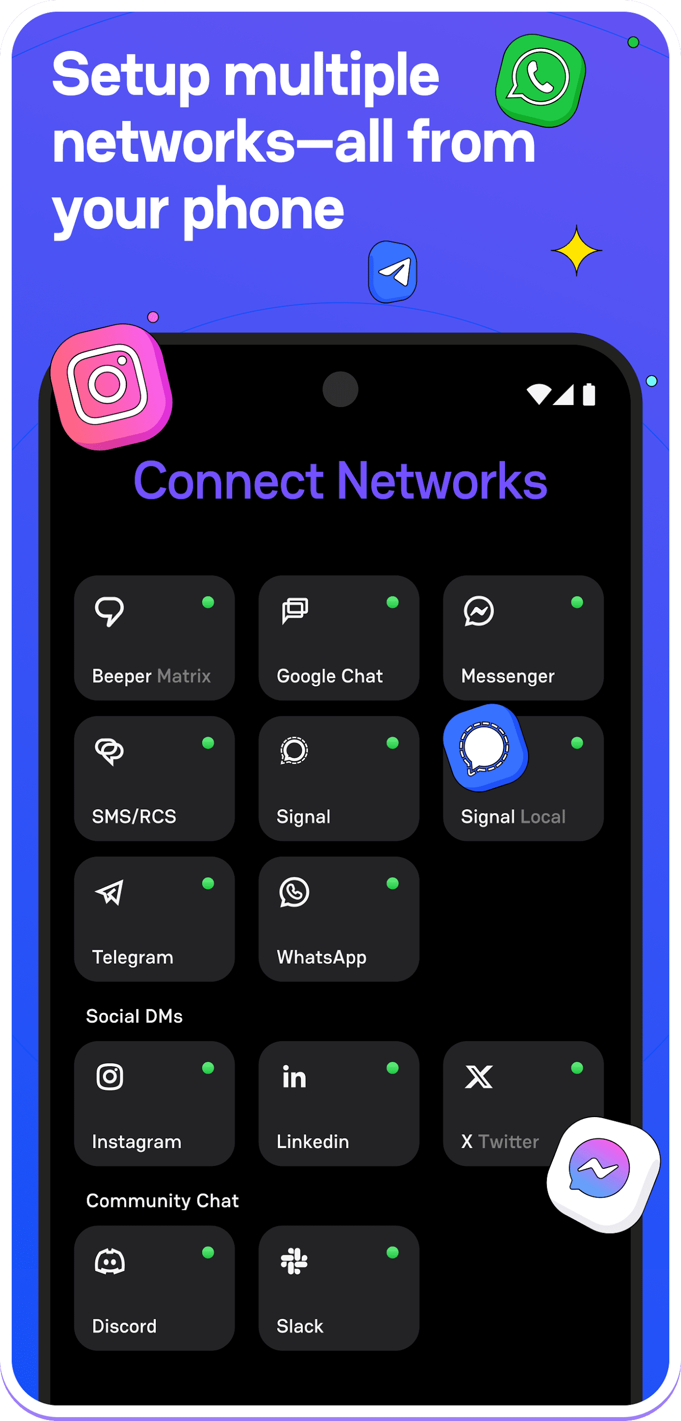 - Объединяет чаты из разных мессенджеров и сетей в одном пространстве.