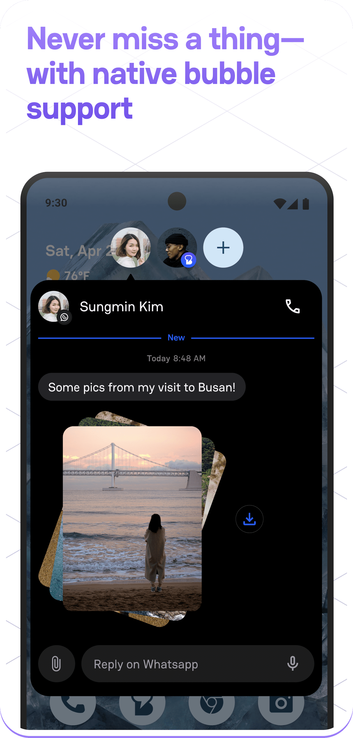 - Работает с уведомлениями и чат-бульбашками для быстрого доступа к сообщениям.