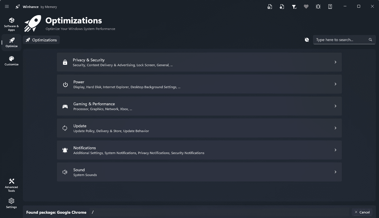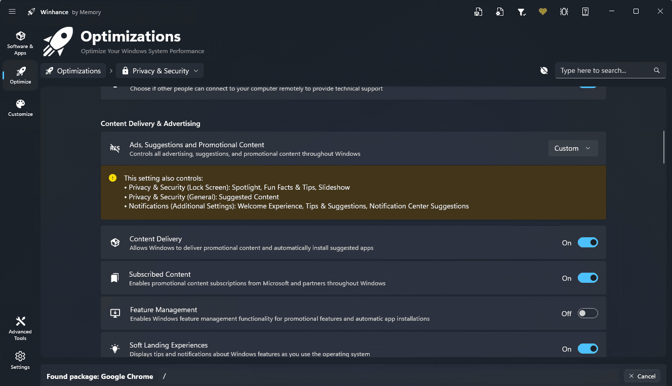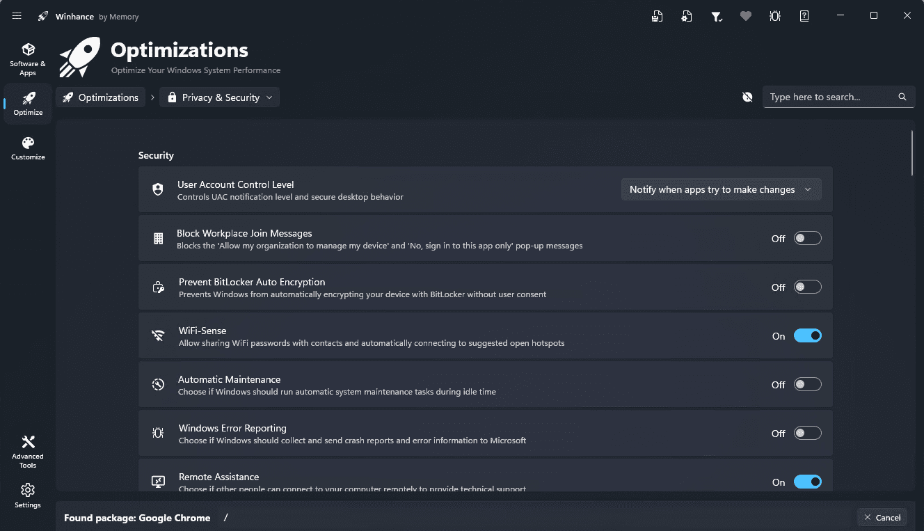 Winhance дает доступ к параметрам конфиденциальности и безопасности, настройкам телеметрии, управлению разрешениями приложений и рекламными компонентами. Дает возможность изменять параметры энергопотребления, игровые настройки или отдельные параметры производительности.