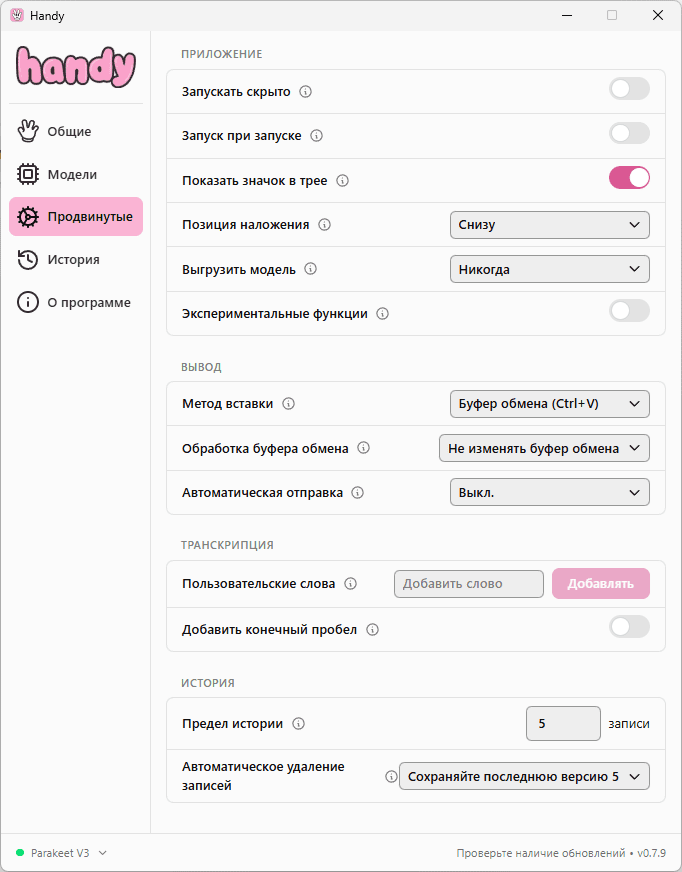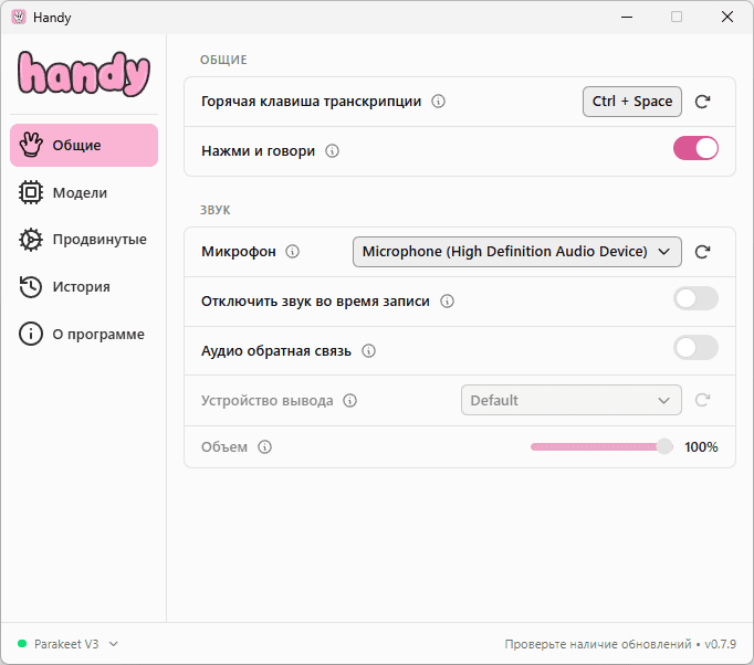 Handy — десктопное с открытым исходным кодом приложение для преобразования речи в текст, которое позволяет вводить текст при помощи микрофона вместо клавиатуры. Программа работает в фоновом режиме и может использоваться практически где угодно: текстовых редакторах, браузерах, мессенджерах, средах разработки и т.д. Достаточно нажать назначенную горячую клавишу, произнести фразу, после чего распознанная речь автоматически вставляется в активное текстовое поле.