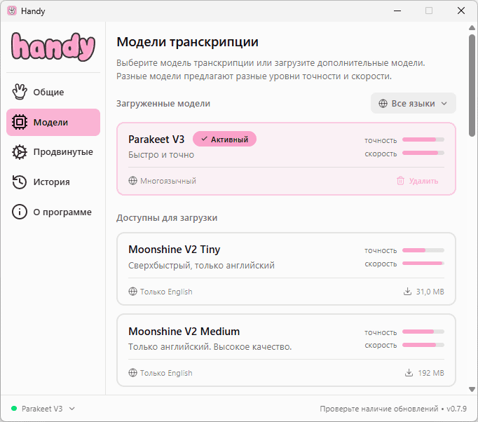 - Поддержка моделей распознавания речи Whisper и Parakeet.