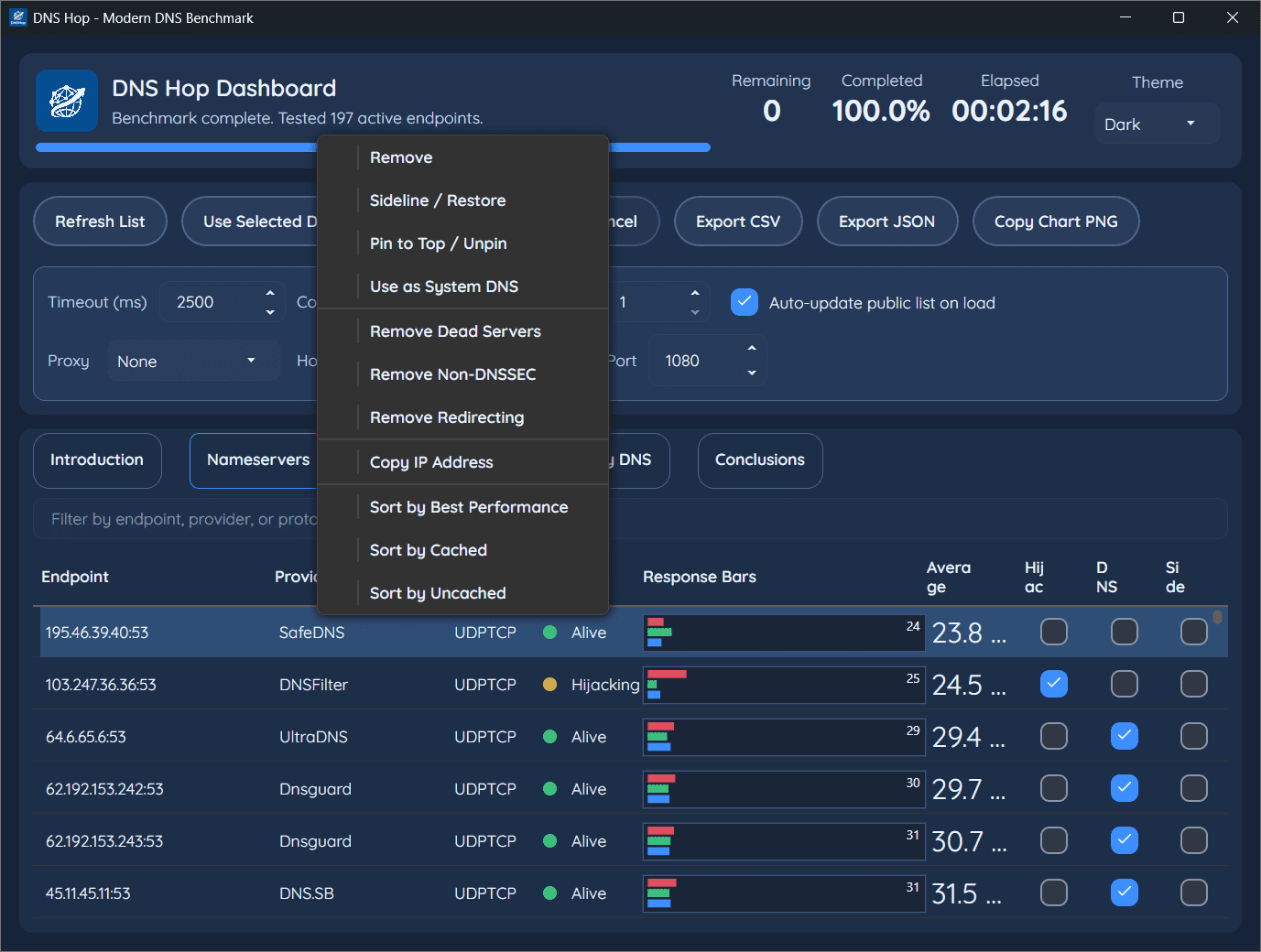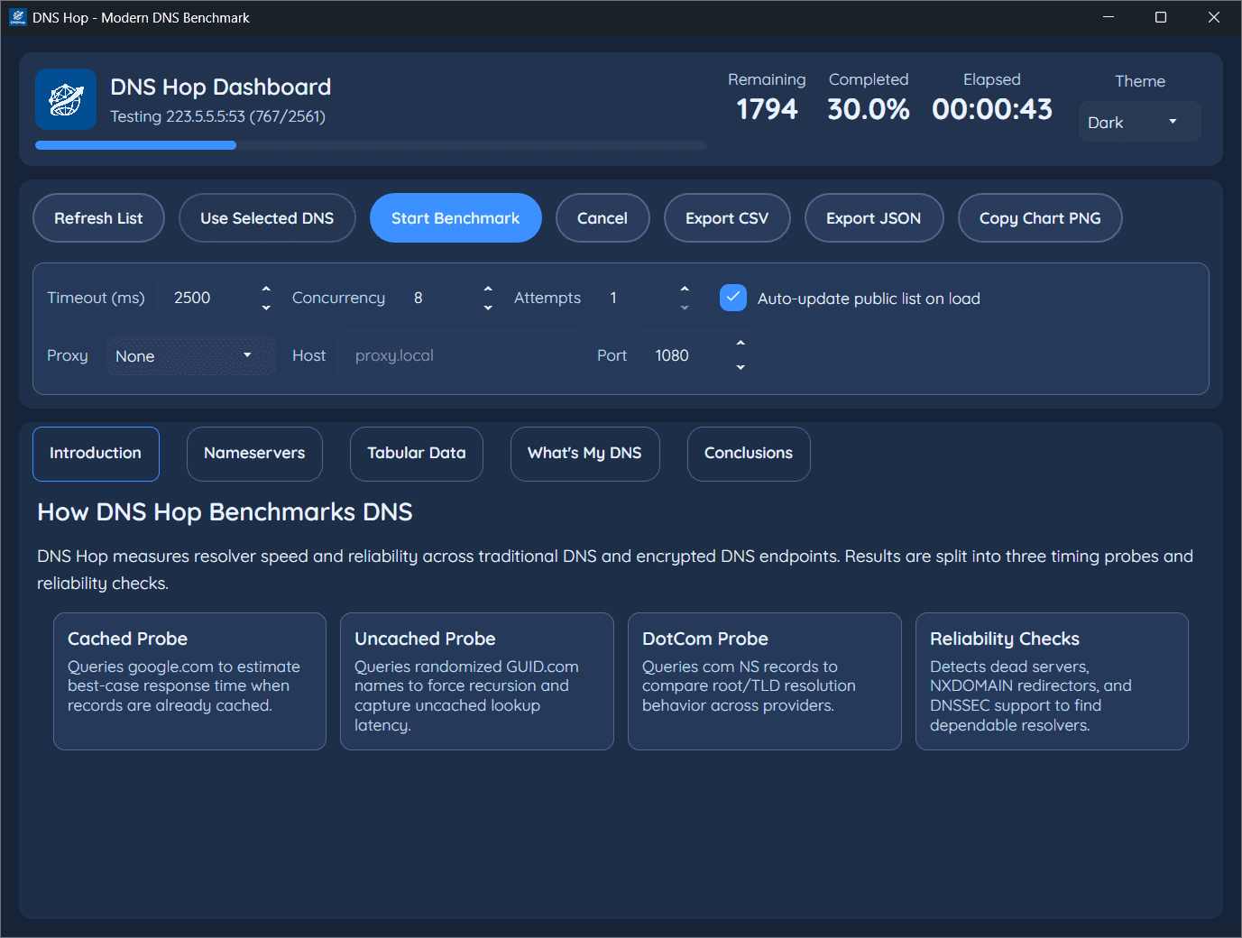 DNS Hop — утилита для анализа и выбора оптимального DNS-сервера для текущего интернет-подключения. Программа предназначена для проверки производительности различных DNS-провайдеров, с целью определения наиболее быстрого и стабильного варианта подключения.