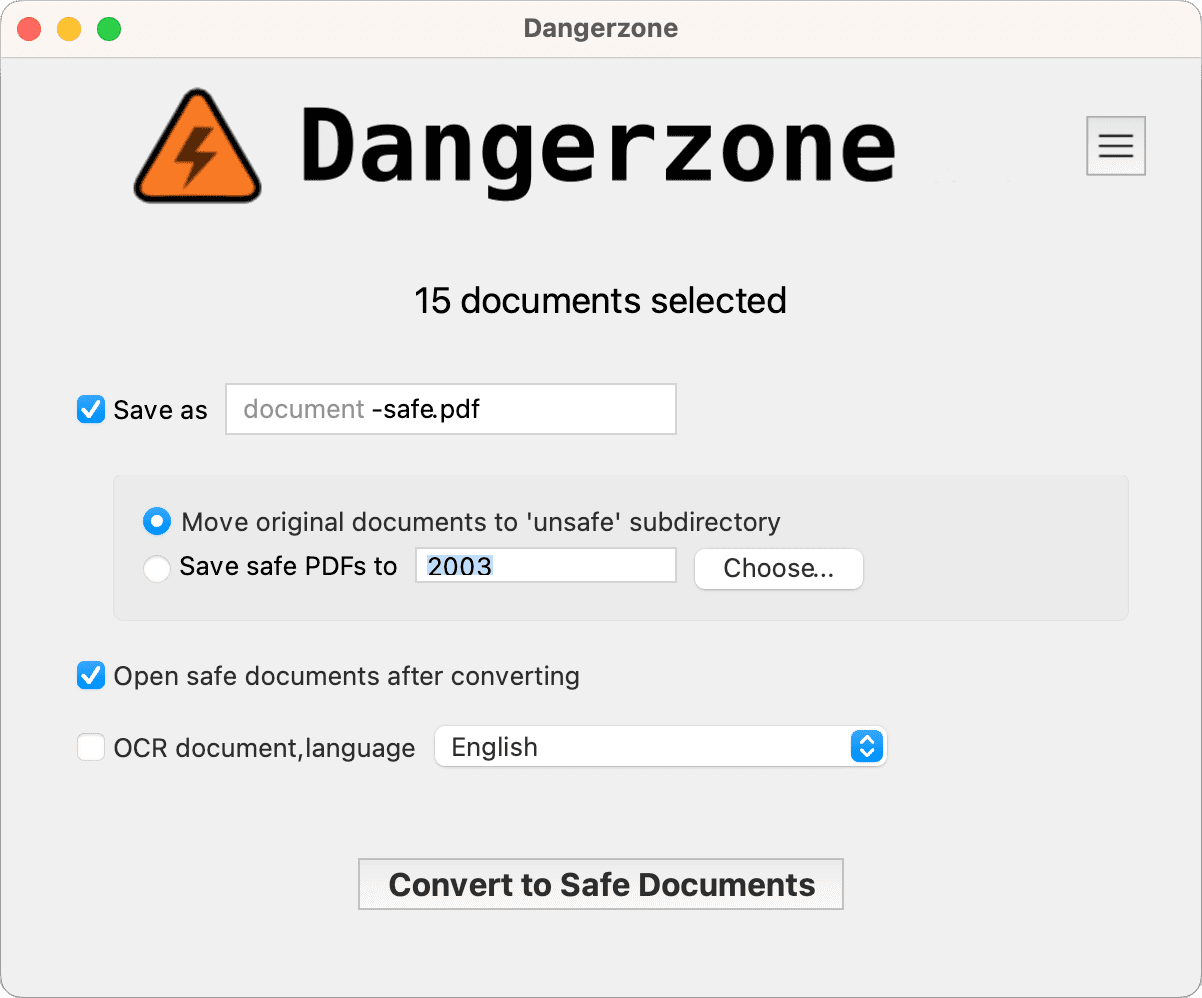 Dangerzone преобразует потенциально опасные PDF-файлы, офисные документы или изображения в безопасные PDF-файлы. Приложение предназначено для работы с файлами, происхождение которых вызывает сомнения: вложениями электронной почты, загруженными документами или изображениями. Программа изолирует обработку таких файлов и формирует новый PDF, пригодный для просмотра без риска запуска встроенных вредоносных компонентов.
