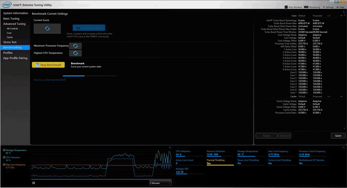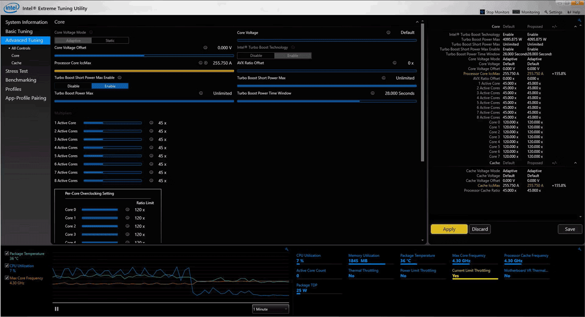 С помощью Intel XTU можно увеличить производительность процессора за счёт разгона или снизить температуру и энергопотребление через андервольтинг. Встроенные инструменты мониторинга отображают текущие параметры системы в реальном времени. Также доступен стресс-тест, который используется для проверки стабильности после изменения настроек.