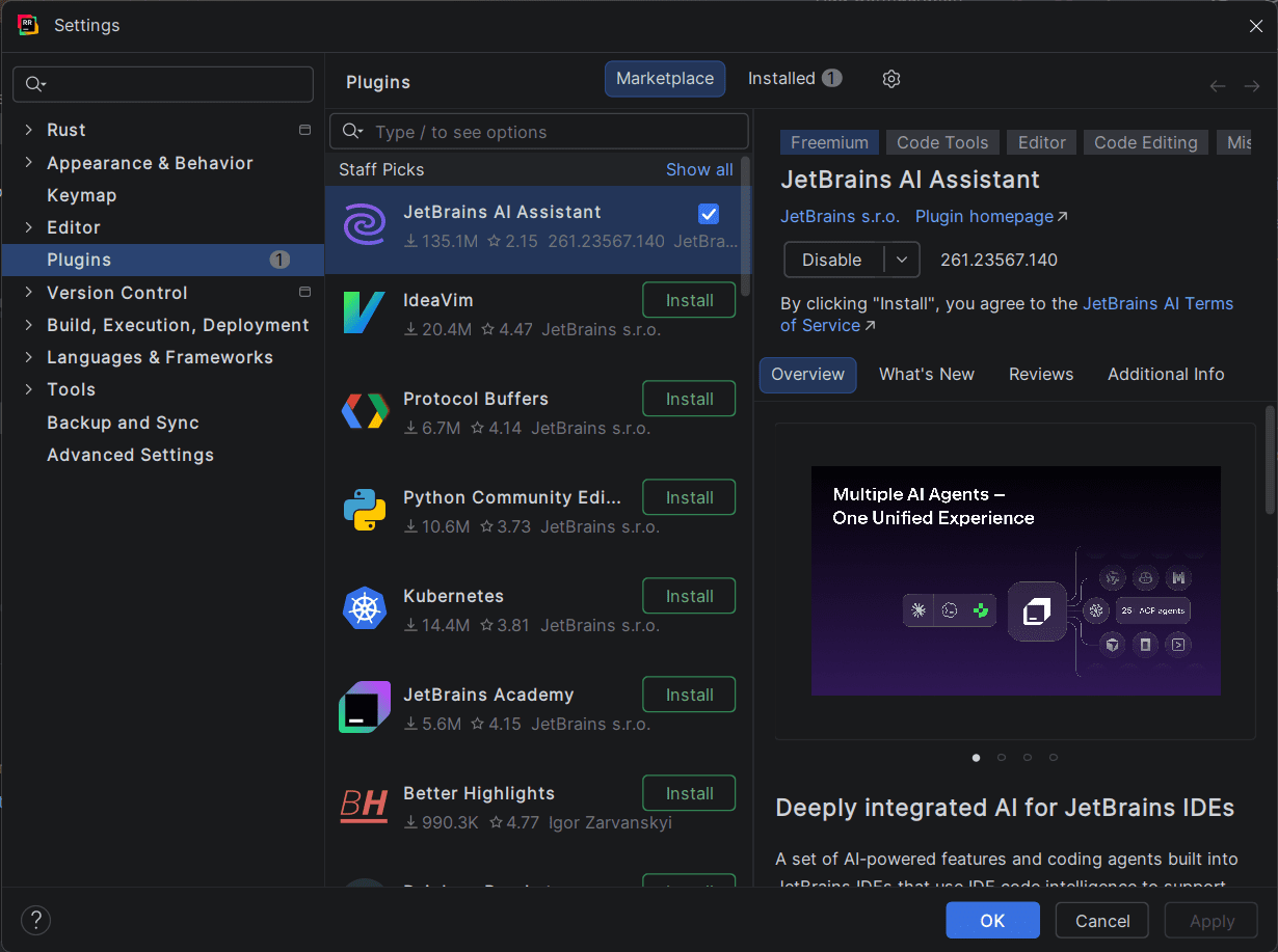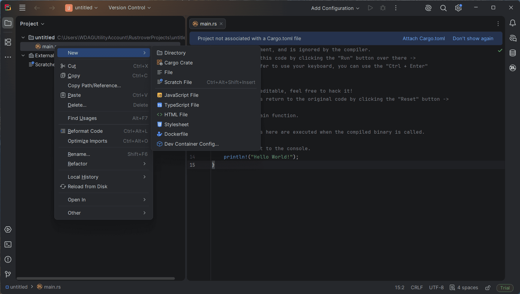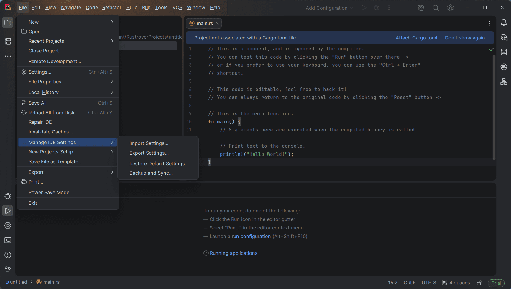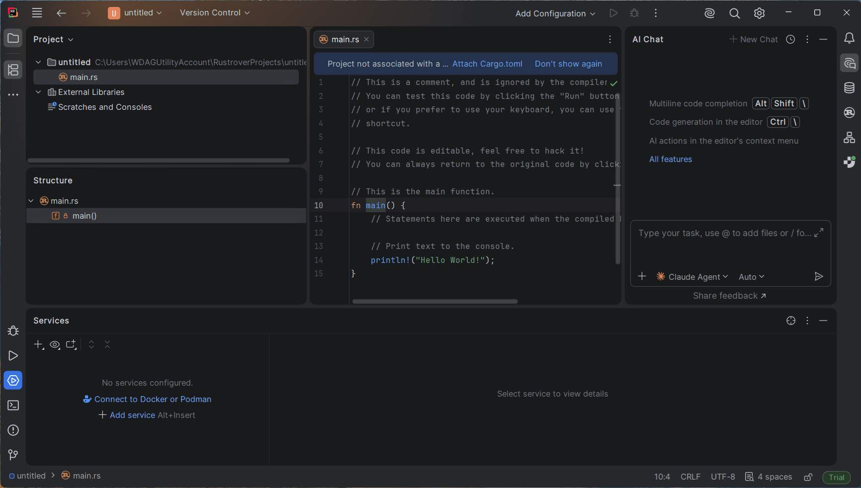 RustRover — интегрированная среда разработки для языка Rust, ориентированная на повседневную работу с проектами разного уровня, которая объединяет редактор кода, инструменты анализа и средства навигации по проекту. Интерфейс позволяет управлять структурой проекта, работать с файлами и переключаться между задачами без лишних действий.