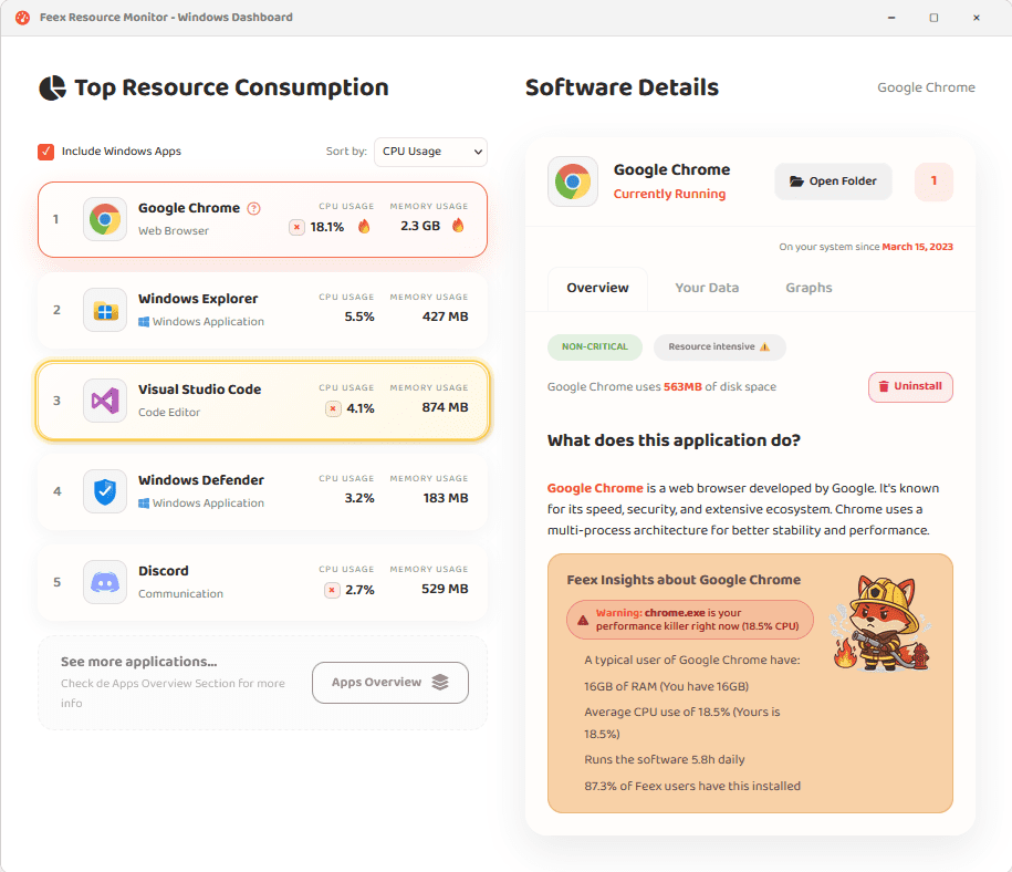 Встроенный монитор процессов позволяет просматривать запущенные приложения и получать пояснения по каждому из них. Сервис использует алгоритмы анализа, чтобы выводить описание процессов, технические данные и базовую оценку их безопасности. Помимо текущих показателей, Feex сохраняет статистику и формирует графики, что помогает отслеживать изменения нагрузки и выявлять отклонения в работе системы.