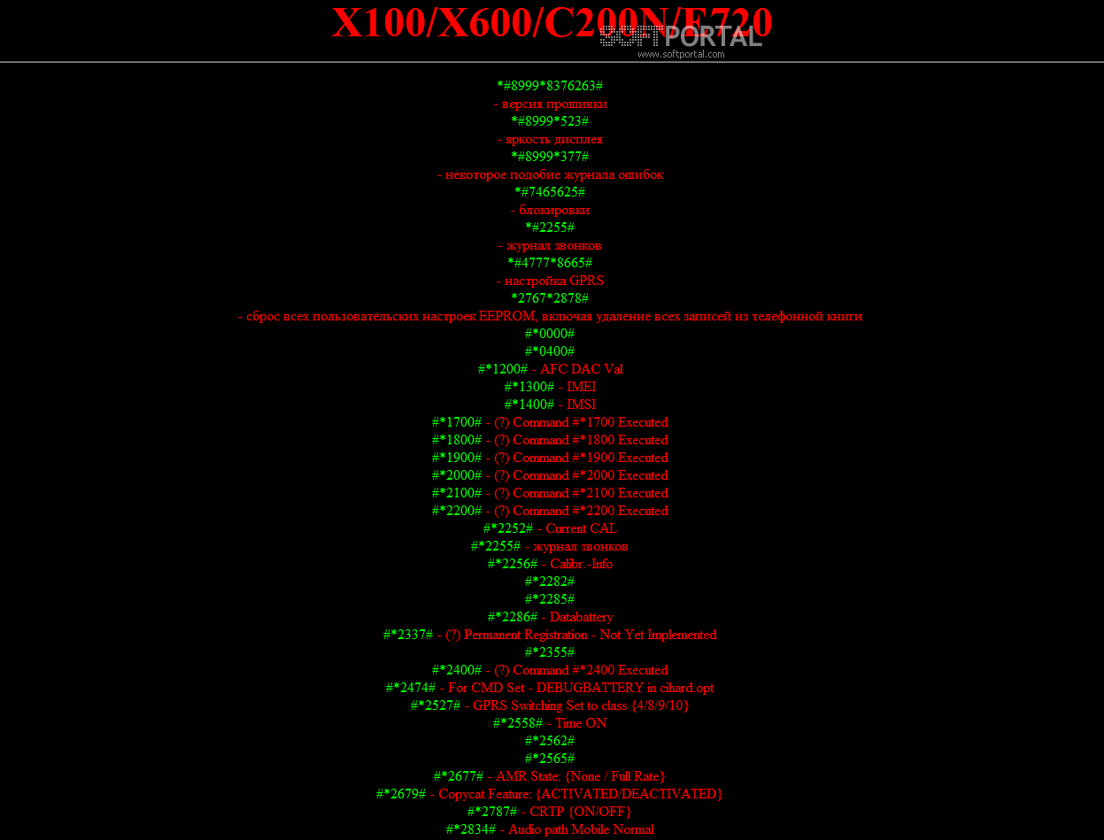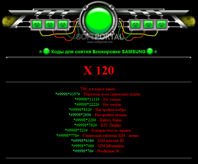 Коды для снятия блокировки у телефонов SAMSUNG - в этом сборнике содержится 245 кодов для усиления динамика, звуков, настройки вибро и звонка, настройки GPRS. Удаление ошибок на телефоне. Информация о телефоне. Версия HW, SW, + Some Code And Data! Сброс настроек WAP на предустановленные значения и многое многое другое!!!