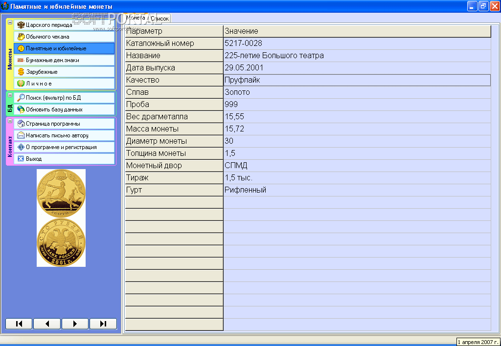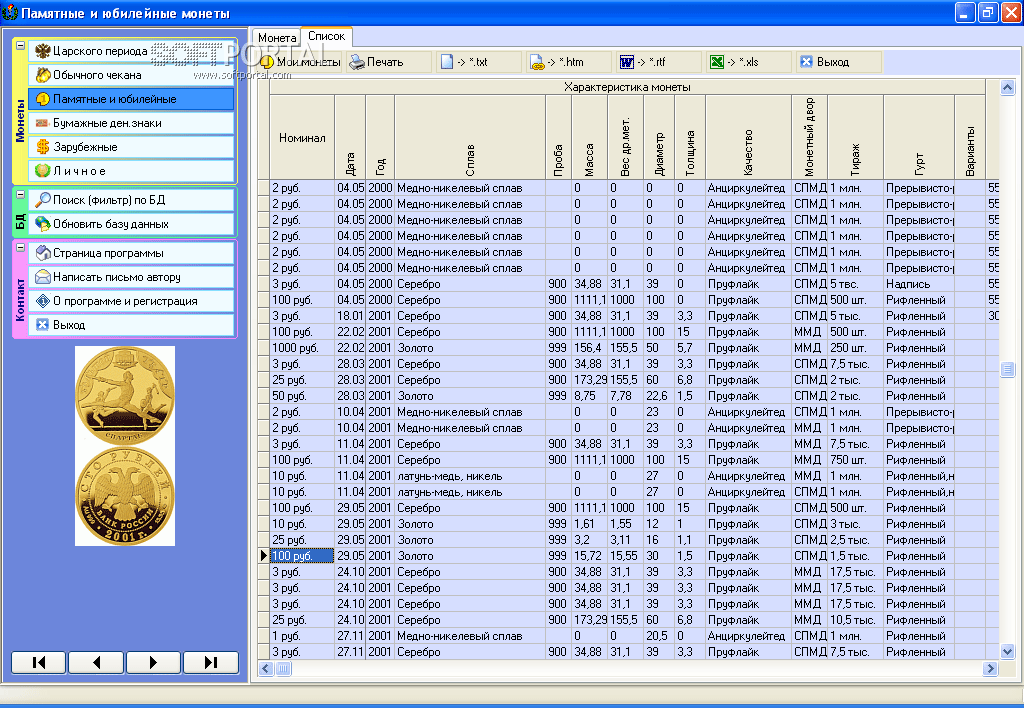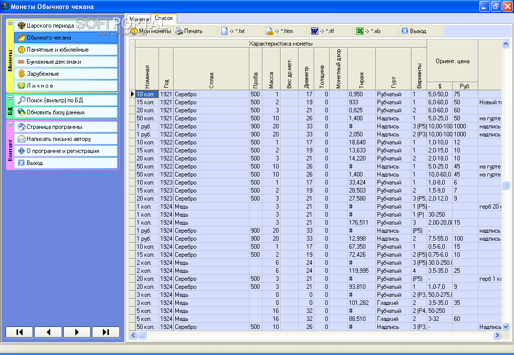 Программа Справочник начинающего нумизмата представляет собой справочник по монетам советского периода и современной России. В справочнике представлены основные параметры монет, такие как масса, диаметр, металл, проба и другие. На многие монеты даны цены в рублях и (или) в долларах. Даны иллюстрации аверса и реверса большинства монет.