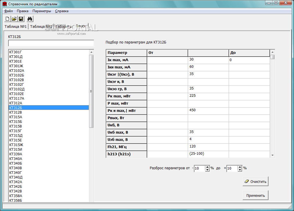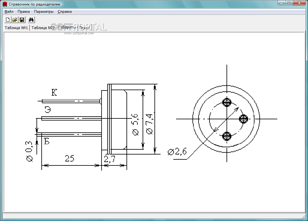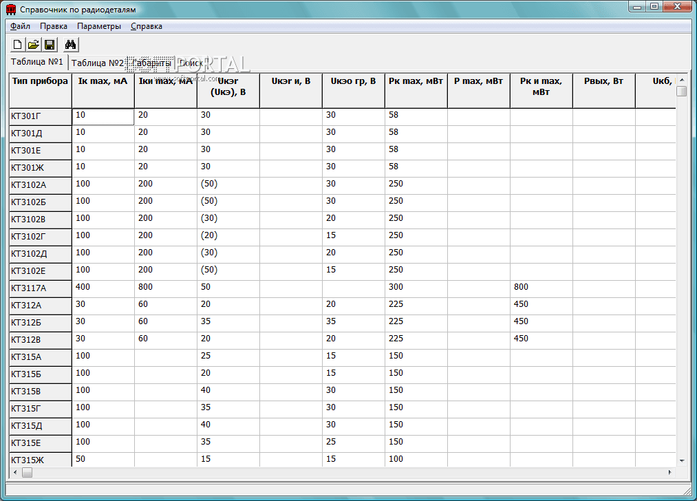 Справочник по радиодеталям - программа для просмотра параметров транзисторов, их редактирования, подбора подходящей замены для транзистора по его параметрам, просмотра внешнего вида транзистора, сортировки по определенному параметру.